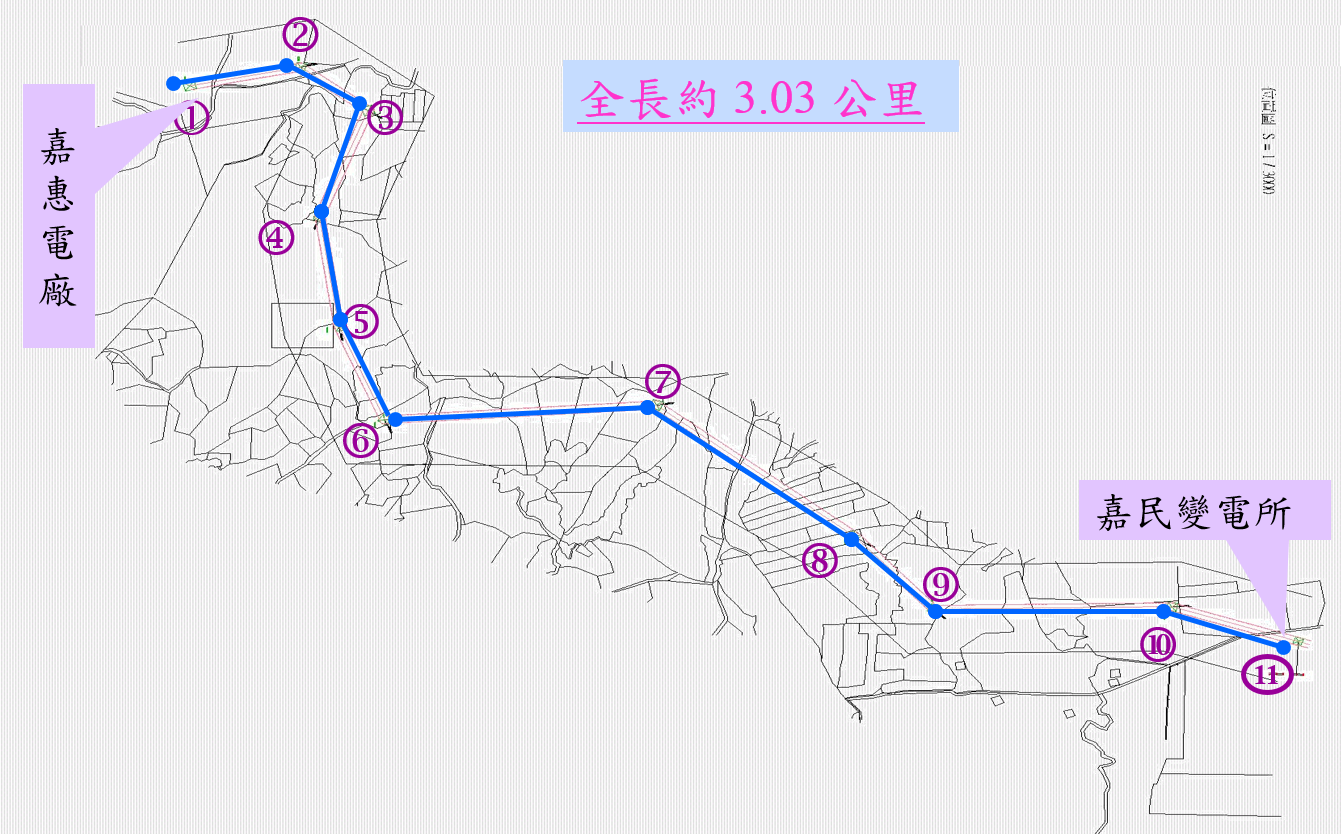 電廠GIS屋內開關場至嘉民變電所以一路雙回線電源線輸 電,長約3公里,設計容量合乎N-1要求。輸電鐵塔由高張 力鋼構架構而成共11座。輸電線每相採用954ACSR 四導體,每回路輸電容量1,200MVA。礙子採用半導體瓷鈾,輸電線路並有雷擊保護、接地線、光纖電纜(OPGW)及其附屬設備,皆參照台電輸電工程標準設計建造。